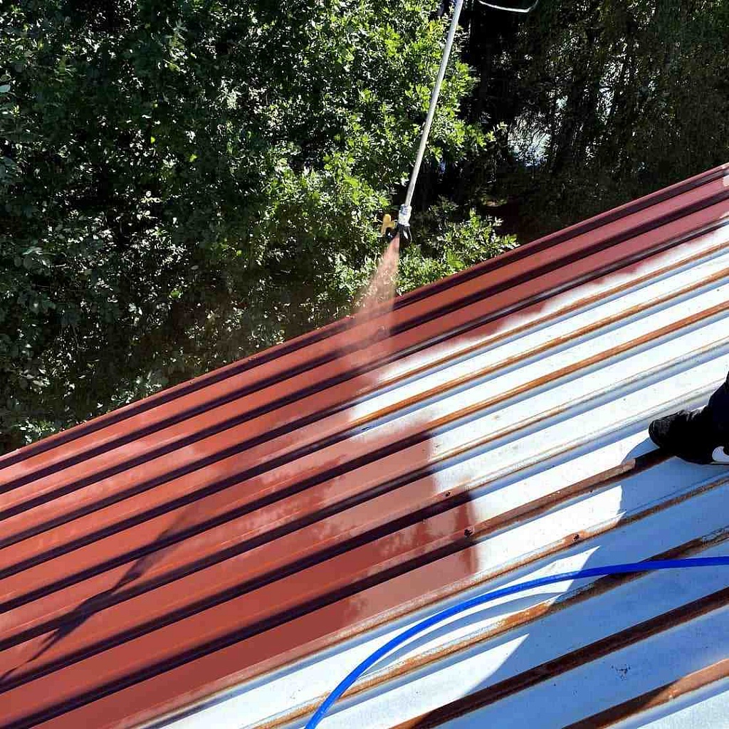 • Чистка крова от коррозии и отшелушивающегося слоя краски. Это будет следующим подготовительным шагом. После того, как крыша высохнет, наша команда производит зачистку от коррозии при помощи специальных щеток по металлу и болгарки (углошлифовальной машинки) с насадками для зачистки. Эта стадия обязательна в процессе покраски.
