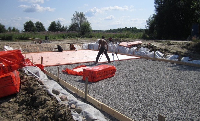 Особенностью фундамента является то, что он, в отличие от других типов, на глубину промерзания грунта не заглубляется. Перед заливкой бетонной смеси формируется основание из смеси песка с щебнем и тщательно утрамбовывается. На этом основании фундамент будто плавает, поэтому его еще называют «плавающей плитой».